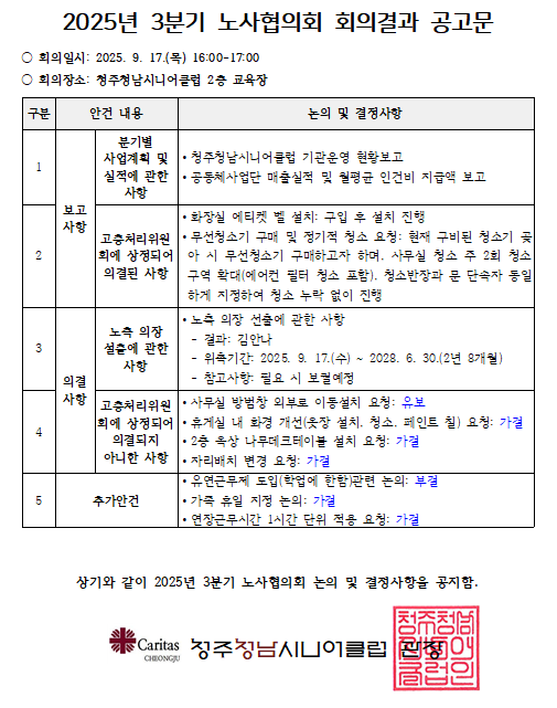 2025년 청주청남시니어클럽 3분기 운영위원회 결과 공고