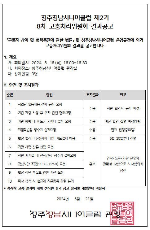 청주청남시니어클럽 2024년 5월 시장형 사업단 사업추진현황 정보공개