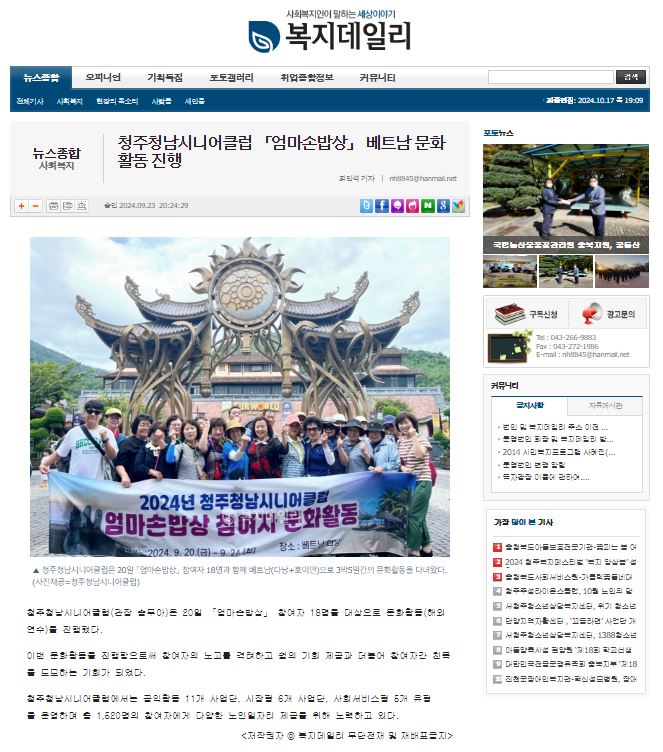 [2024. 9. 12. 복지데일리] 청주청남시니어클럽, 노인일자리 참여자 문화활동 진행